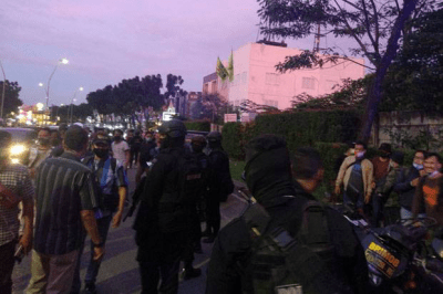 Pantauan di lokasi, personel polisi dan TNI siaga berkumpul di sisi jalan dan hingga pukul 18.25 WIB, bantuan petugas terus berdatangan. Kebanyakan mereka membawa senjata api dan senjata pelontar gas air mata.