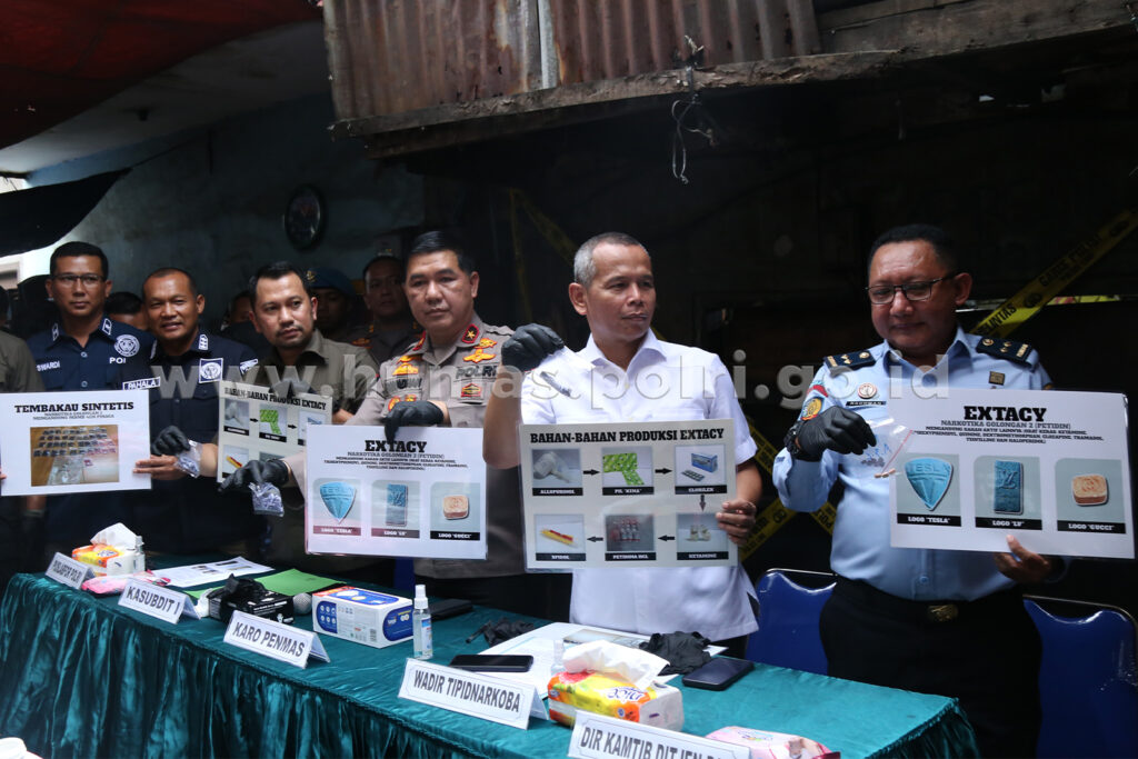 Adapun dalam kasus ini, penyidik menyidik menyita barang bukti sebanyak 146 butir ekstasi berbagai logo dan 349 gram serbuk ekstasi dari tersangka SP, 37 gram tembakau sintesis dari tersangka MR, peralatan kitchen lab, dan alat komunikasi.