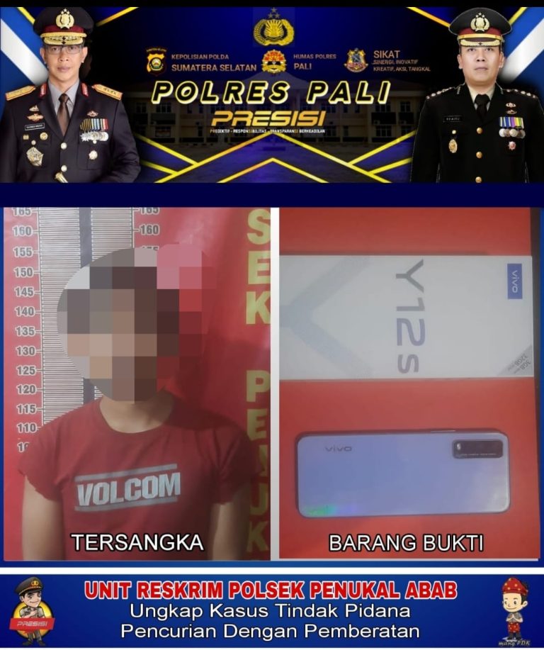 “Ditangkap nya terduga AN (27 tahun) tindak pidana pencurian dengan pemberatan degan barang bukti, satu (1) buah kotak Handphone merk Vivo Y12s warna Glacier Blue dengan No. IME1: 866660054844950, IME2: 866660054844943, Satu (1) unit Handphone merk Vivo Y12s warna Glacier Blue dengan No. IME1: 866660054844950, IME2: 866660054844943,” ujar Kapolsek mewakili Kapolres PALI.