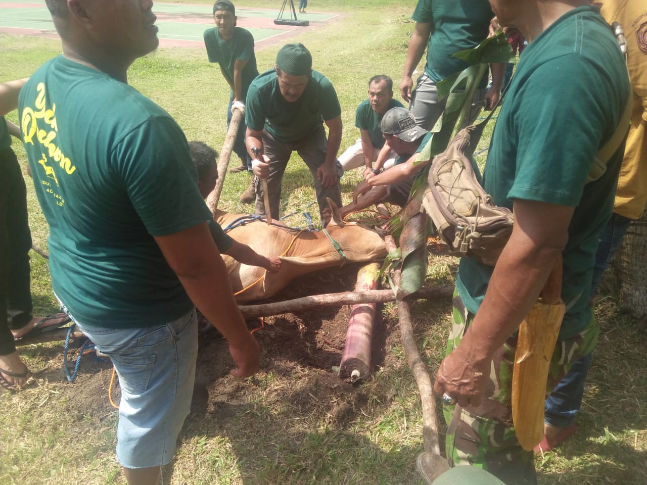 Pemotongan hewan Qurban dilaksanakan di lapangan Bola Volyy dan Vola Basket Komplek Pertamina Adera Field Desa pengabuan Kecamatan Abab Kabupaten Penukal Abab Lematang Ilir (PALI) Sumatera Selatan.