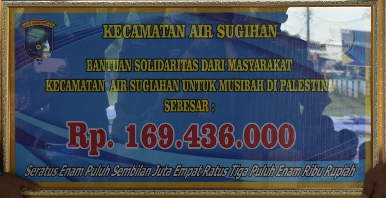 Masyarakat Kecamatan Air Sugihan menyerahkan bantuan berupa uang tunai sebesar Rp. 169.436.000,- (Seratus enam puluh sembilan juta Empat ratus tiga puluh enam ribu Rupiah) yang diserahkan langsung ke Badan Amil Zakat Nasional (Baznas) Kabupaten Ogan Komering Ilir di Halaman Kantor Camat Air Sugihan. Jumat,(01/12/2023)