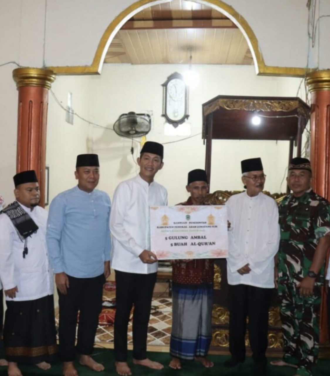Pada kesempatan tersebut, Bupati PALI menyerahkan bantuan berupa lima gulung ambal dan lima mushaf Al-Qur’an untuk Masjid At-Thahirin sebagai bentuk dukungan terhadap kegiatan keagamaan di desa tersebut.